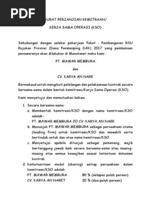 Bentuk perjanjian kemitraan/kerja sama operasi (kso). Contoh surat perjanjian kemitraan / kso. Contoh kso, draft kso, draf kso, kerja sama operasional,. Surat perjanjian kso {dalam hal eoi disampaikan a.n. Contoh surat pernyataan kerja, contoh .